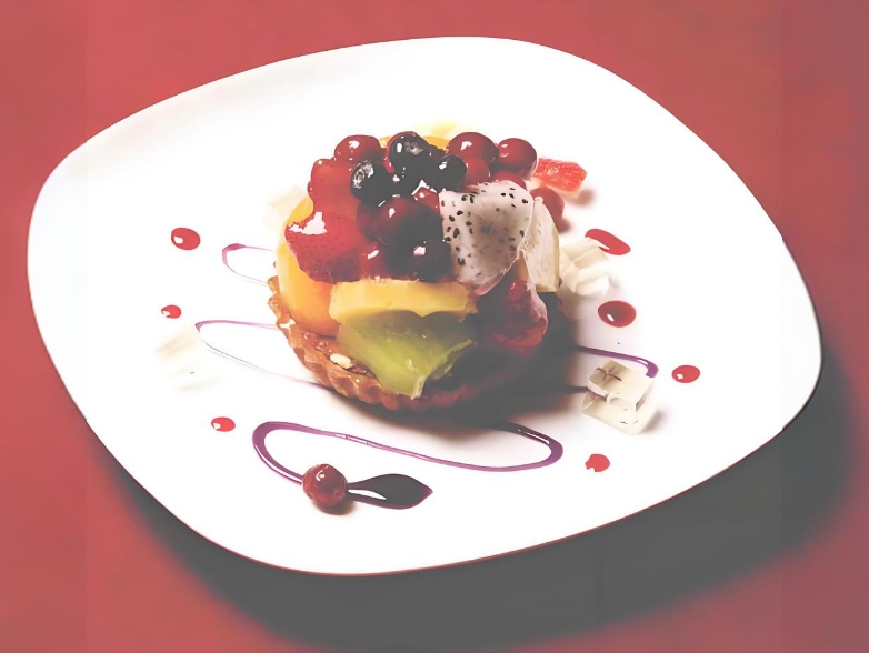 フルーツタルトは高さを積み上げるだけでなく、プレート全体の線や色彩も強調することができます。真っ白な四角い皿を使うと、これらの特徴が際立ち、フルーツの曲線との対比も美しくなります。