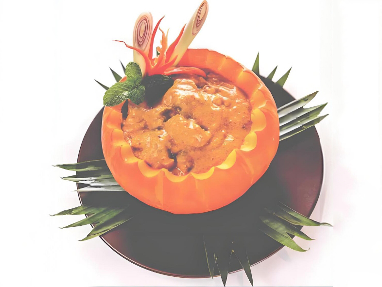 作り方:まず、かぼちゃを約25分蒸し、蒸しあがったかぼちゃを少し冷ましてから、中をくり抜いて器として使用します。くり抜いたかぼちゃの中身は、牛肉とカレーと一緒に混ぜ合わせ、料理の食感に層を加えます。牛肉は細長く切り、柔らかくなるまで煮込み、カレーと炒め合わせます。最後に一緒に煮込み、出来上がったら鍋から取り出します。味付けにはミントの葉とレモンリーフを加えて風味を引き立てます。