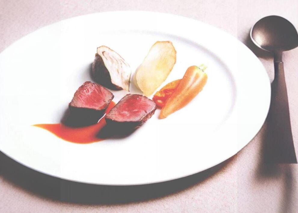 食材自体が持つさまざまな明暗や鮮やかな色合いを活かすため、清潔感がありながらも、皿の縁に繊細な模様のある白磁を選ぶと、全体が鮮やかでも散漫にはならない。副菜は薄切りとピューレ状の二通りの方法で盛り付け、全体のテーマ性を強調し、食べる際にはパリッとした食感と滑らかな口当たりの多様さを楽しむことができる。