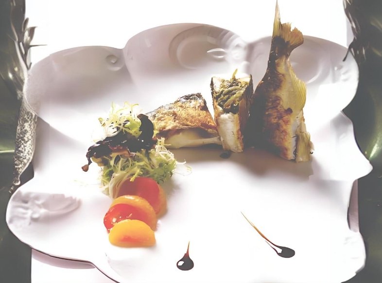 この盛り付けには、特別な形状の大きな花びら型の円形プレートが使用されています。主菜とプレートのサイズの差が大きいため、どのようにバランスよく配置するかがデザインの最大の課題となります。プレートの空間を埋め、立体感を作り出すために、鮎を三つに切り、断面を見せて酸菜の詰め物を引き立て、食欲をそそるように工夫しています。尾は上向きに伸ばし、頭は横向きに配置して視覚的な広がりを演出しています。また、視線の流れを引き継ぐために、シェフは少量の付け合わせをプレートに散りばめていますが、要素を増やしすぎて雑然としないように気を配り、清潔でシンプルなスタイルを保っています。