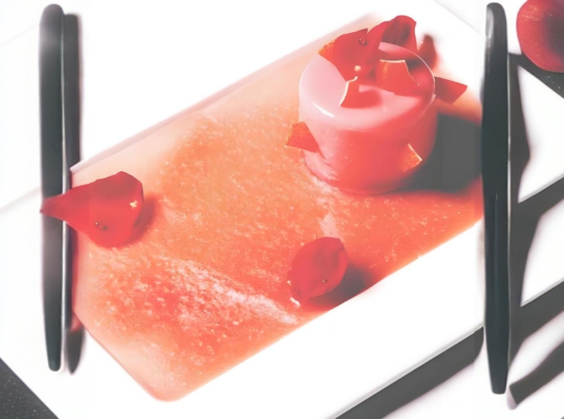 ④ 最後に、食用のバラの花びらを加え、透明なシロップで露の効果を演出します。バラの花びらを添えることで、盛り付けに彩りを加え、ロマンチックで美しい物語の雰囲気を引き立てます。