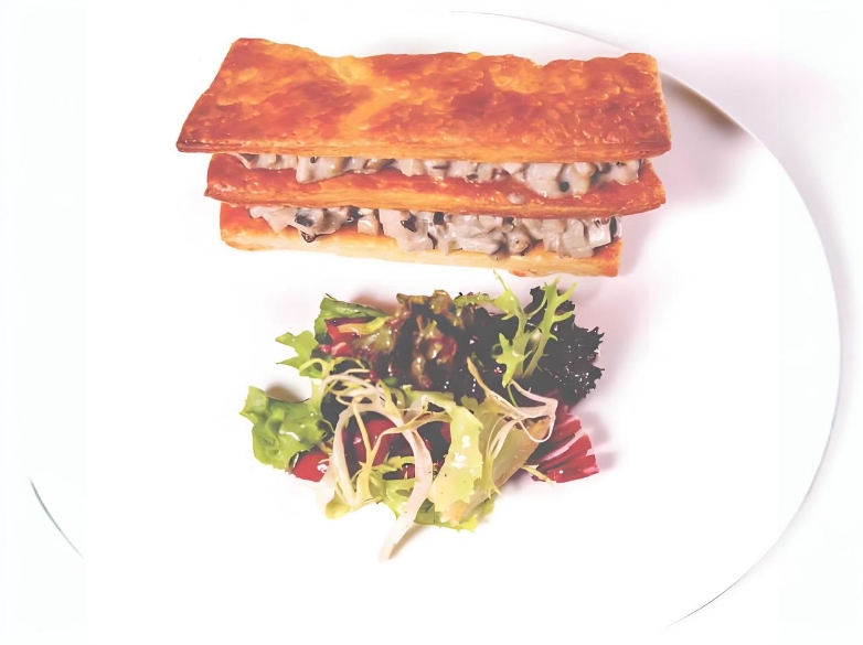料理にバリエーションを持たせるために、シェフはひらめきで、通常の具材をパイ生地で包む方法を変え、ナポレオンケーキのように層を重ねるコンセプトを取り入れました。そして、炒めたての新鮮なトリュフマッシュルームを層の間に挟み、分解された美しい層が際立つように仕上げました。この料理の立体感を引き立てるために、大きなお皿を選びました。このようにアート感がありながらシンプルな盛り付けは、初心者が家で挑戦するのにも最適です!