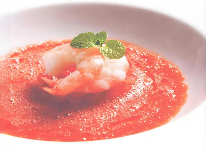 作り方:トマト、パプリカ、セロリ、玉ねぎ、ニンニク、オリーブオイルをミキサーに入れて液状にし、濾し器でスープを濾します。トマトを角切りにし、茹でたロブスターの殻をむいて、盛り付けに使用します。
